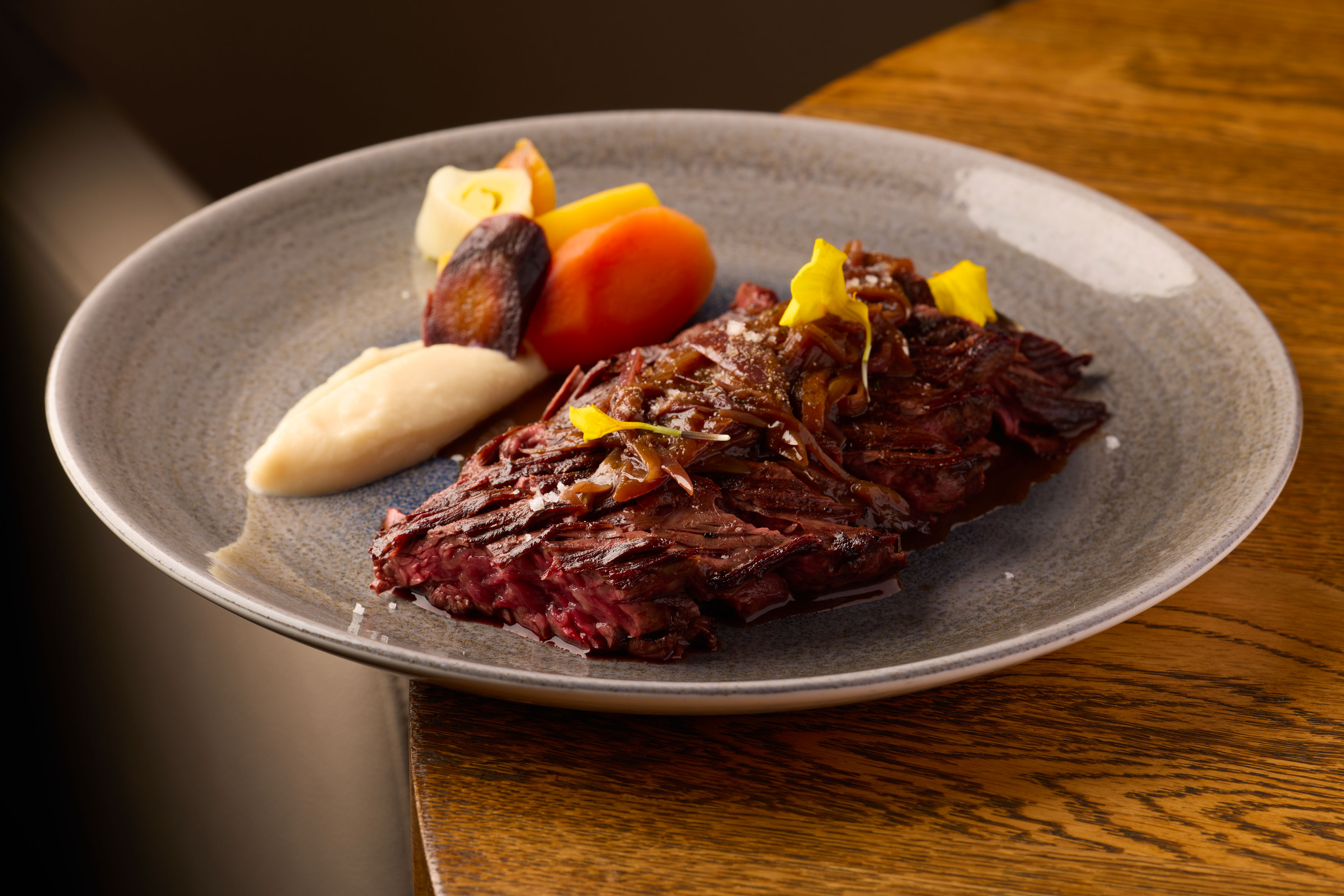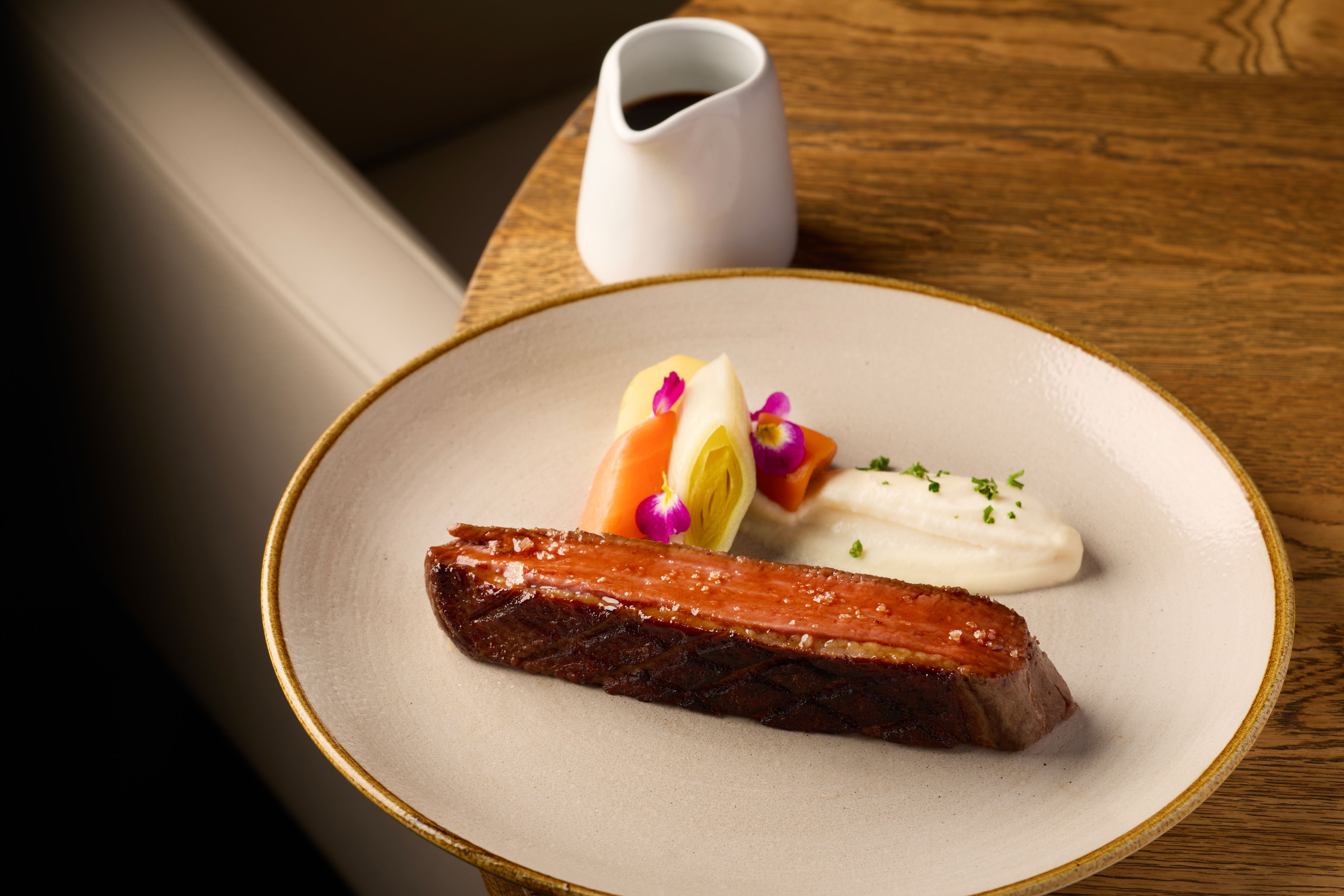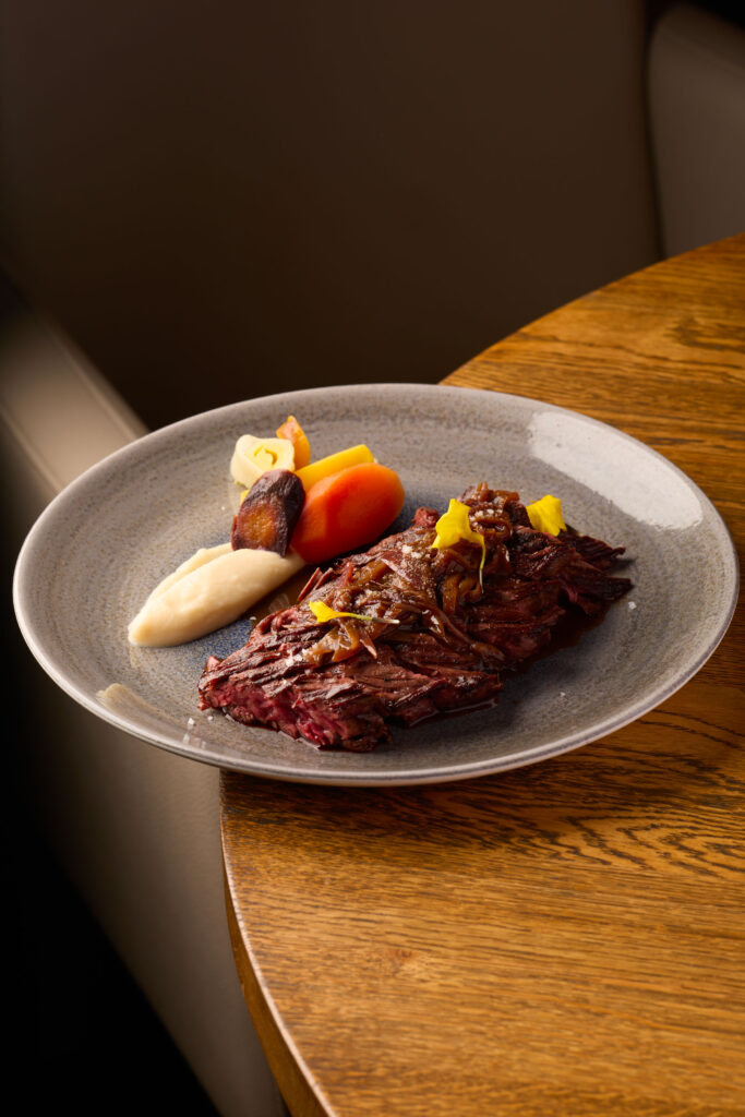 Onglet de boeuf, sauce échalotes confites et pinot noir