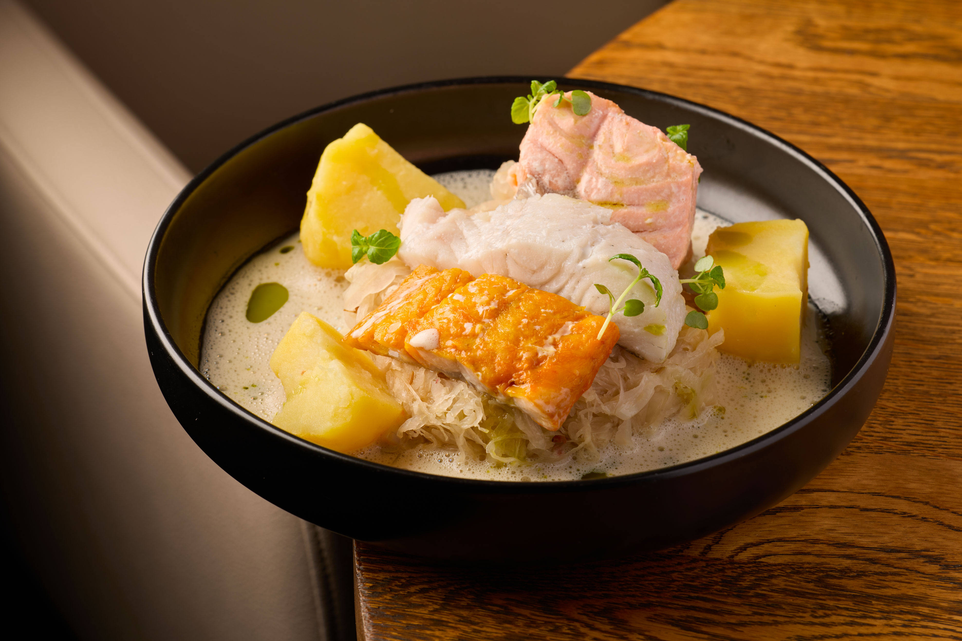 Choucroute aux trois poissons, sauce au Riesling (Sandre, saumon, haddock fumé)