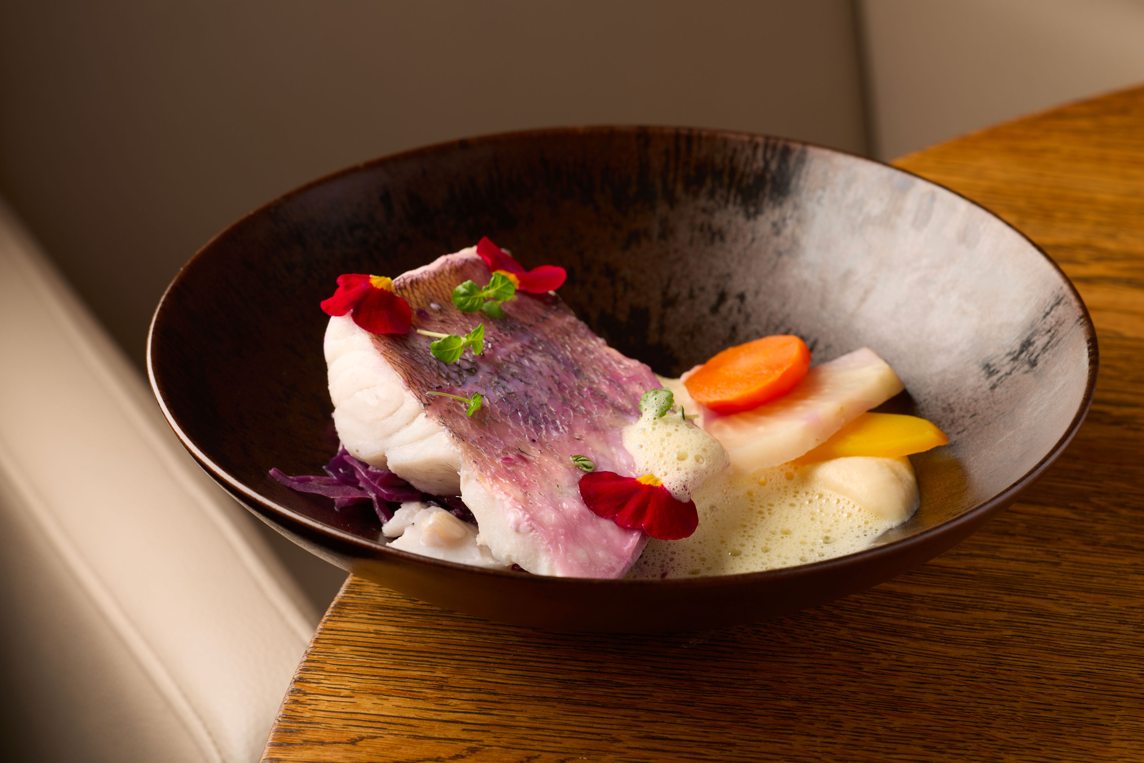Waedele laqué au miel fruit de saison, mousseline de pommes de terre
